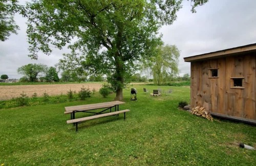 Cozy cabin on a mixed farm with great views of surrounding fields and forests. Take a walk through the property, and take in the fresh air, veggie gardens, chickens, and cattle.