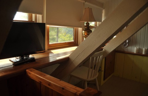 The master bedroom upstairs has a queen bed, half-bath, and breathtaking views of the lake from a built-in desk (if you absolutely have to answer that one email, but we really recommend you don't). Downstairs is a full bath (shower only, no tub), but we highly recommend using the private and screened outdoor shower by the sauna (only occasionally will you get an audience of squirrels).